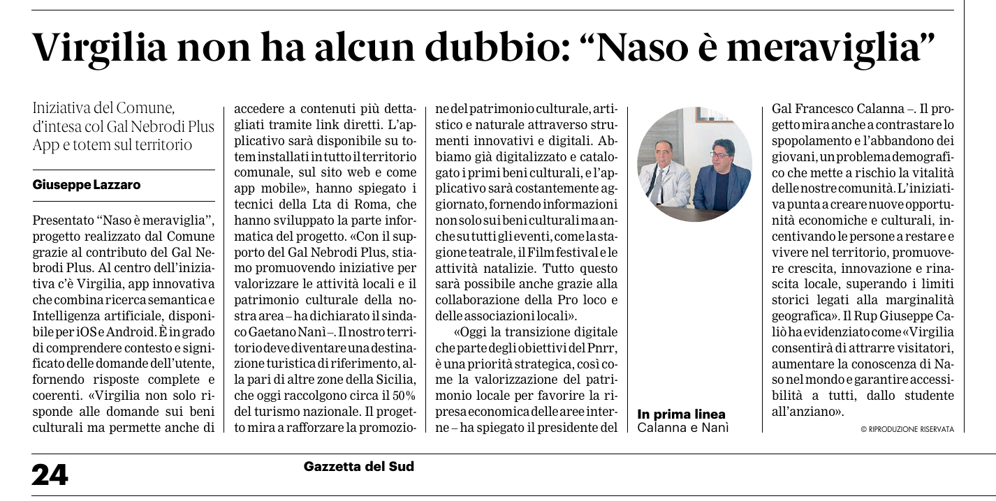 Il Rup Giuseppe Caliò ha evidenziato come «Virgilia consentirà di attrarre visitatori, aumentare la conoscenza di Naso nel mondo e garantire accessibilità a tutti, dallo studente all’anziano».